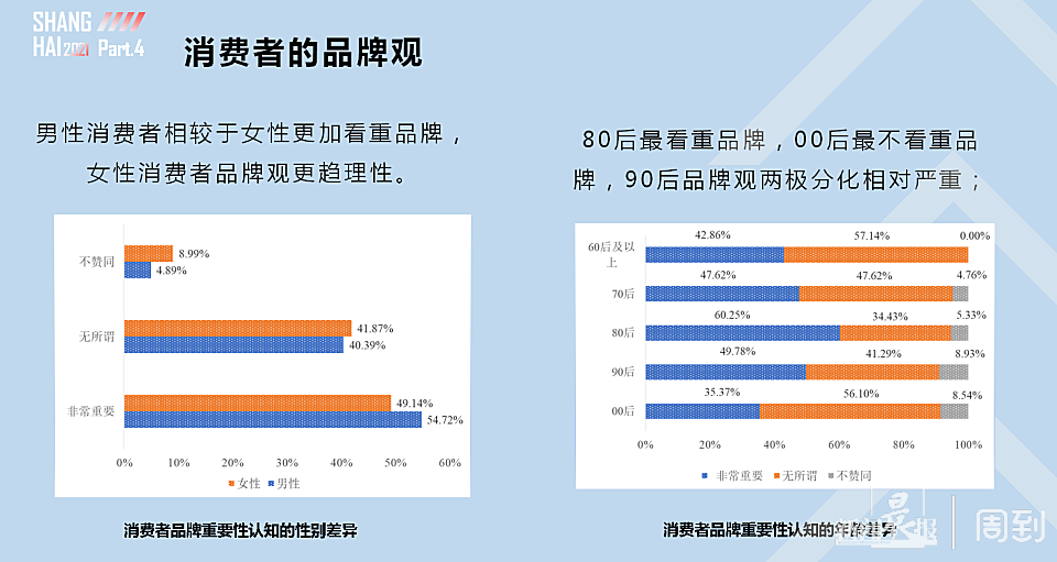 上海男性消费者相较于女性更加看重品牌,女性消费者品牌观更趋理性。消费者品牌观调查显示,上海男性消费者相较于女性更加看重品牌,女性消费者品牌观更趋理性。80后最看重品牌,00后最不看重品牌,90后品牌观两极分化相对严重。