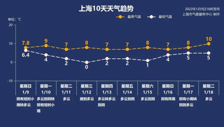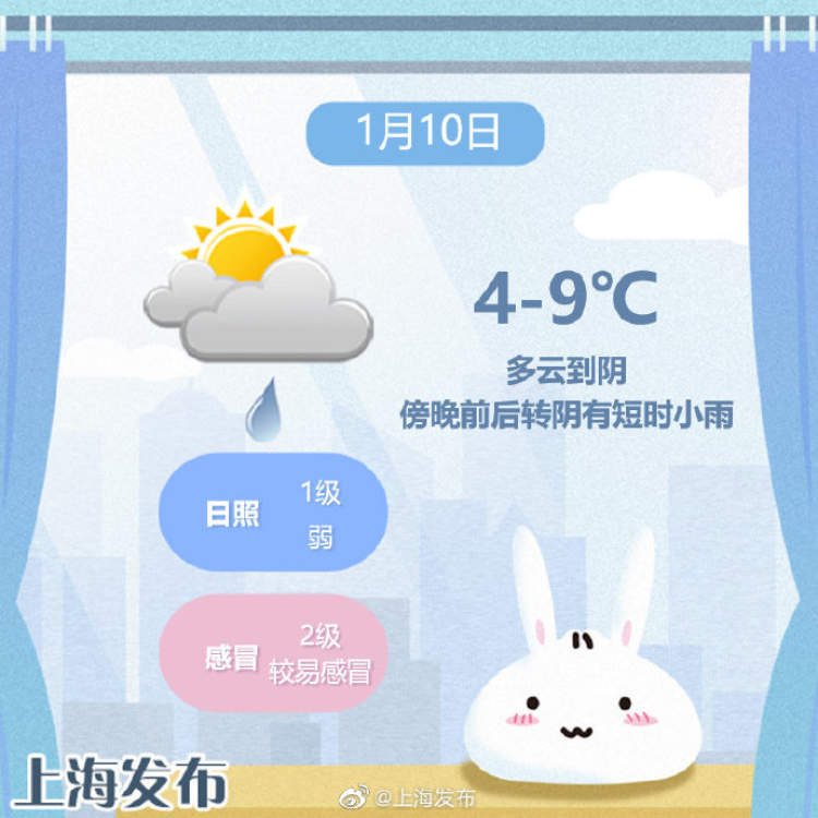 今天本市多云到阴,傍晚前后转阴有短时小雨。最高温度9度,最低温度4度。今天早晨局部地区有雾,中午以前有轻度霾。偏北风3-4级,夜里转西北风4-5级阵风6级,沿江沿海地区5级阵风6-7级。预计冷空气在今天夜间抵沪,给上海带来大风降温天气,空气质量也将转为良。