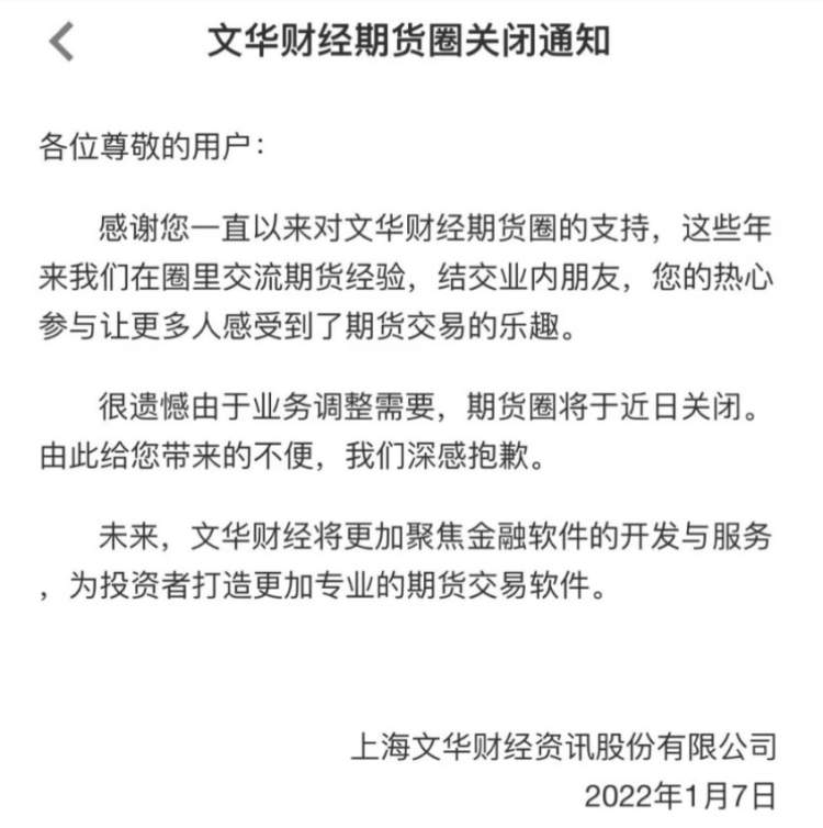 1月7日下午,国内最大的期货交易软件商文华财经在其手机随身行App上发布通知,近日将关闭旗下的用户交流平台——“期货圈”。