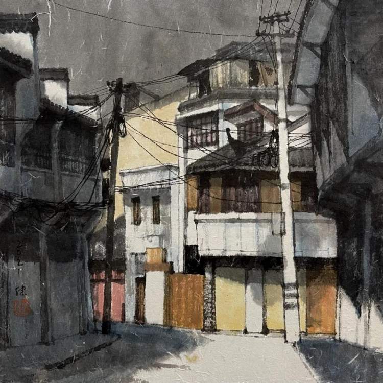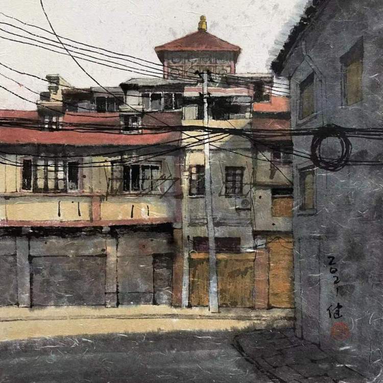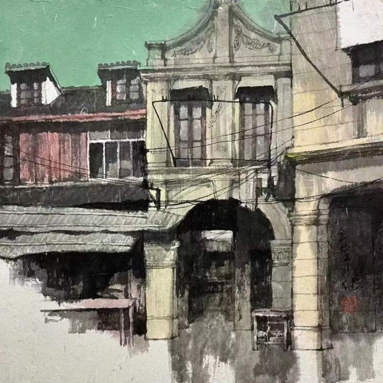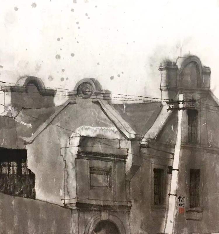 洪健表示,中国古代绘画里,除了界画,并没有画建筑的,界画描绘的也都是金碧辉煌的宫廷建筑。上海城市包容开放,能吸收新的东西,上海艺术家的思维相对来说比较活跃,更能吸收外来东西,并融合本土元素。1950年代以来,上海中国画院的老前辈们也都画过新的城市生活主题。因为有上海这座城市,艺术家们才能作出这样新的实验和尝试。我对于城市建筑主题创作,也是鉴于这样的基础。我最有感情的,是这座城市的建筑、街道和气息,我希望画出这座城市本质的东西,包括西区老洋房,也包括老城厢。