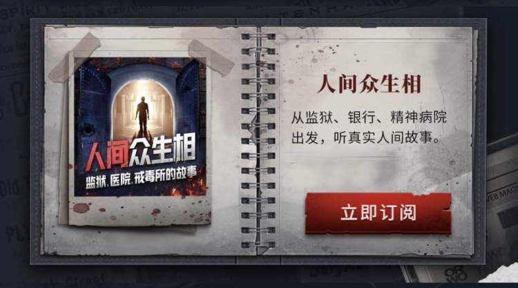 除了上述五部作品以外,喜马拉雅还与网易人间合作推出了专辑《人间众生相:监狱、医院、戒毒所的故事》,由喜马拉雅站内知名主播杏花散人进行讲述。近百个真实故事,记录了医生、心理治疗师、记者观察到的真实事件,以及服刑人员、吸毒者、精神病人的亲身经历,从中洞察人间百态,揭露人性善恶。