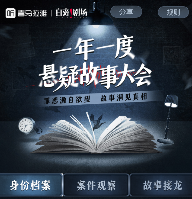 除了这一系列悬疑精品专辑陆续与广大听众见面,近期,“白夜剧场”还推出了“一年一度悬疑故事大会”。在活动中,听众既可以聆听包括法医、缉毒警察、精神科医生、线人等身份在内的多种特殊职业人群的故事,了解他们背后不为认知的秘密,也可以在故事接龙中,自己做侦探,参与故事创作或者为案件线索投票。