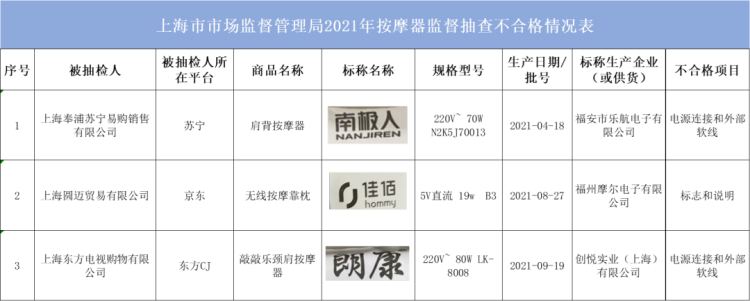 针对消费者投诉、举报集中以及质量问题较多的产品,近期,上海市市场监督管理局对京东商城、i百联、东方cj、天猫、苏宁5个网络平台销售的按摩器进行了监督抽查。经检测,有3批次不合格。