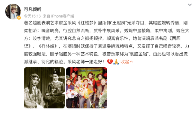 今天,金采风去世消息传出,戏剧界和各界人士、广大戏迷无比悲痛。