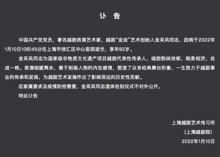 中国共产党党员,著名越剧表演艺术家,越剧“金派”艺术创始人金采风同志,因病于2022年1月10日10时45分在上海市徐汇区中心医院逝世,享年92岁。