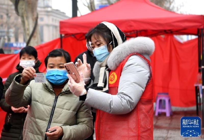 1月7日,在郑州市经八路办事处一处检测点,75岁的志愿者耿小娣(左)在引导市民排队。