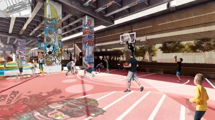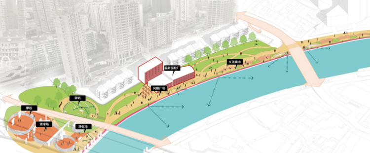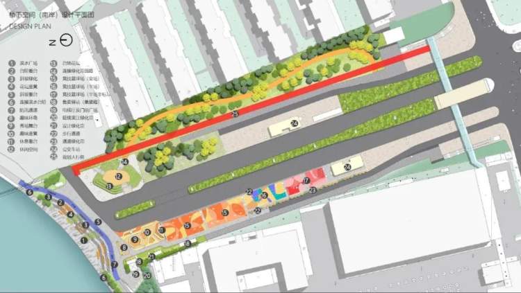 静安区南北高架苏州河北岸桥下空间:拟增加滑板、攀岩、三人足球等多元潮流运动功能;优化内部运动空间交通流线和外部人车通行交通流线;置入一条联动地块的人行景观栈道,打造城市优美的灯光景观,全面提升桥下空间的景观品质。