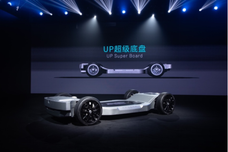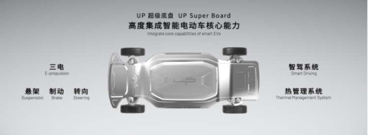 悠跑UP超级底盘具备集成传统白车身的能力,能够将三电、悬挂、制动、转向、电池、电动传动系统、悬架等组件排布在一个类似“滑板”的底盘内;它在实现集成一体化设计的同时,还具备整合传感器、计算平台及各类服务应用等智能化软硬件的能力,并使其成为一个独立的“滑板结构”,可实现独立驾驶和软硬件的持续迭代。UP超级底盘的研发标准性能上对标传统豪华车型,如宝马5系、奔驰E系列以上等。