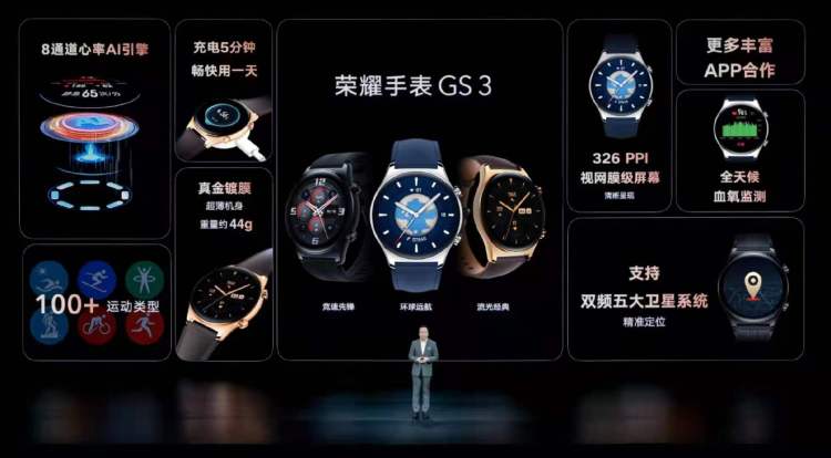 2022年1月10日,荣耀发布折叠屏手机Magic V的同时,也发布了荣耀手表GS 3,售价1299元起,能实现24小时全天候健康监测,而且内置高德地图、薄荷运动等应用等。