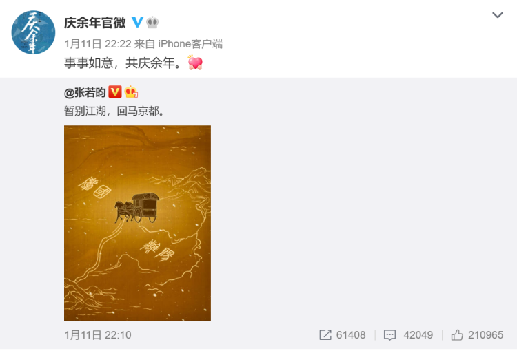 值得一提的是,同为新丽电视出品、主创阵容也颇为相似的的《庆余年》也与《雪中悍刀行》上演梦幻联动。在张若昀发微博表示“暂别江湖,回马京都”后,《庆余年》官方发布“事事如意,共庆余年”,《庆余年2》何时开机、《雪中悍刀行2》何时启动,也引发观众讨论。对此,有消息称,《庆余年2》目前尚未开机,但相关工作已经提上日程。