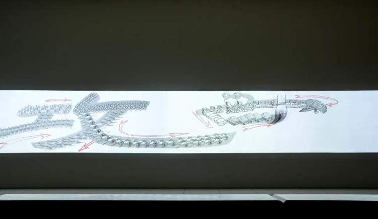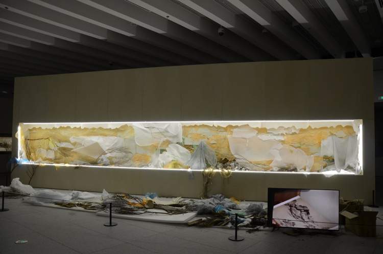 步入3C展厅,你会被灯箱里的《桃源仙居图》画卷所吸引。远看以为是水墨画,走近一看,画中细节居然是麻丝、干枯树枝、塑料袋等等废弃物的影子,走到画作背后,一切真相大白。徐冰借此“光的绘画”,造就了一出“背后的故事”,是对中国二维古画的完美演绎。