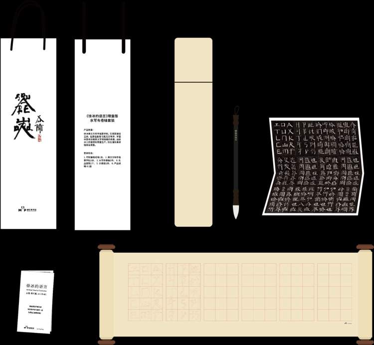 ▲《英文方块字书法入门》是根据徐冰的《英文方块字》特别推出的书法水写卷轴套装,采用可循环使用的布艺材料,印有英文方块字描红,可蘸清水书写。