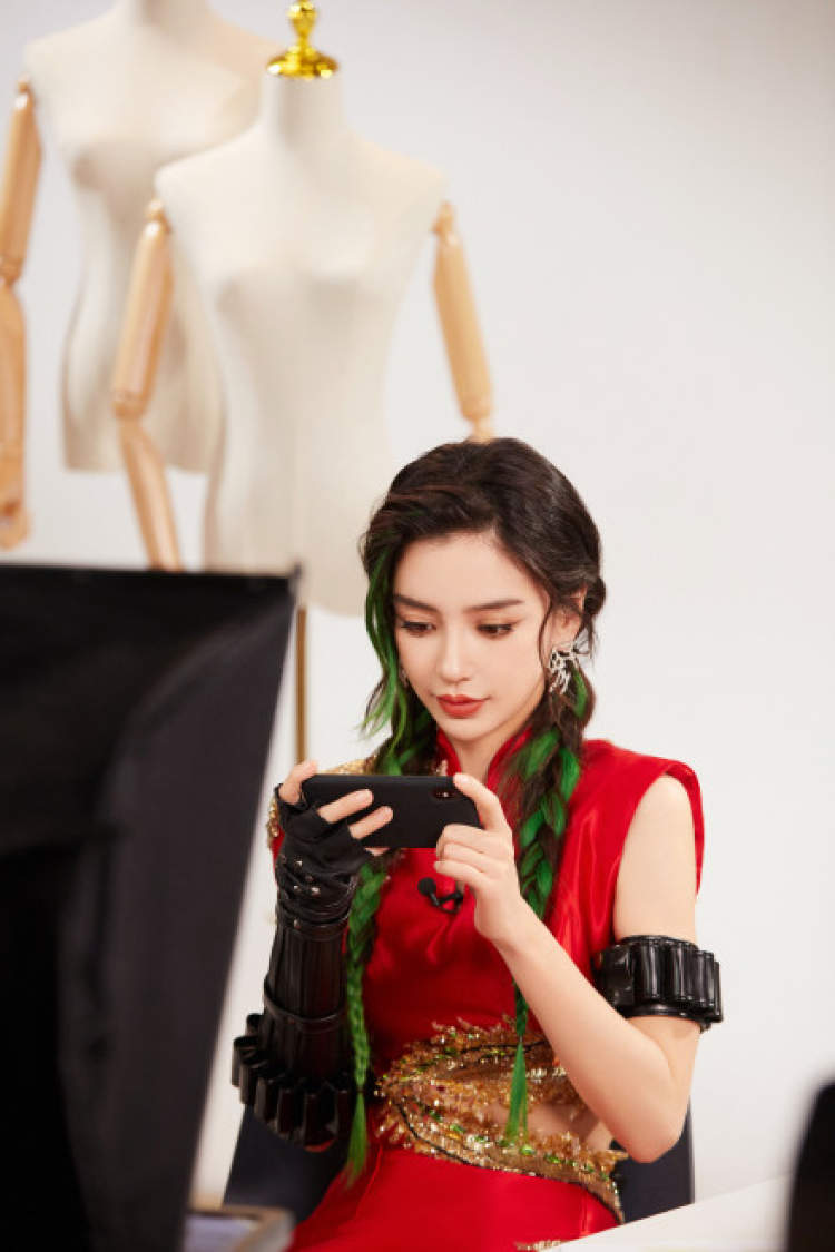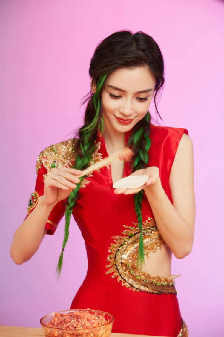 这组红色紧身春节限定旗袍造型,显得杨颖身材纤瘦,青春可爱。绿色接发,本来在红、金色中突兀,但杨颖的颜值撑住了,不仅不觉得违和,甚至觉得洋气很多。