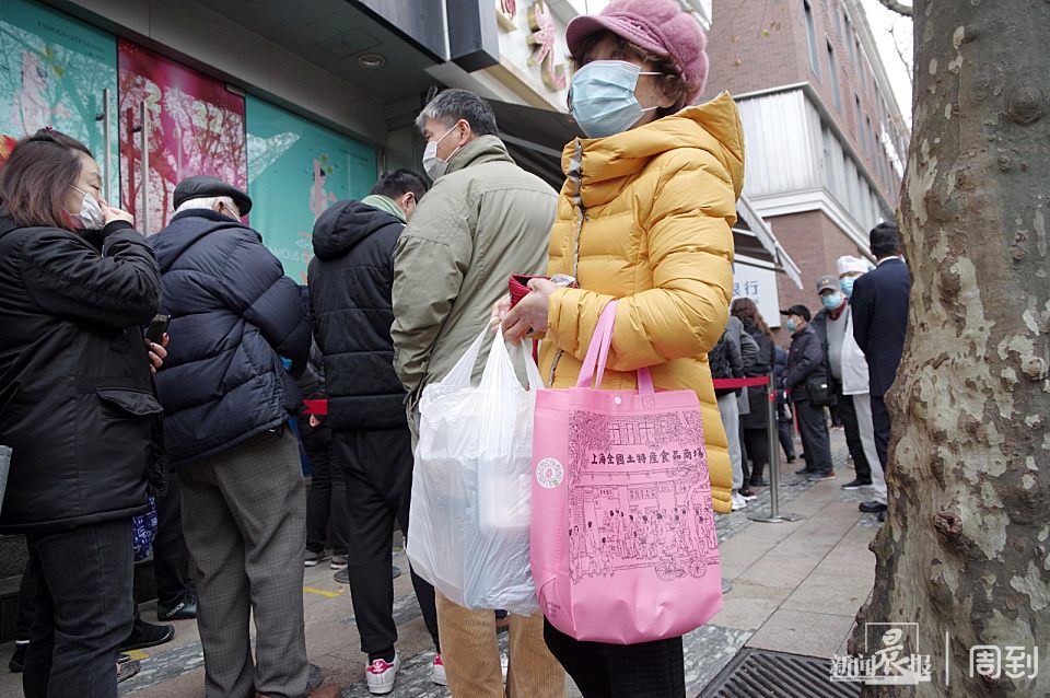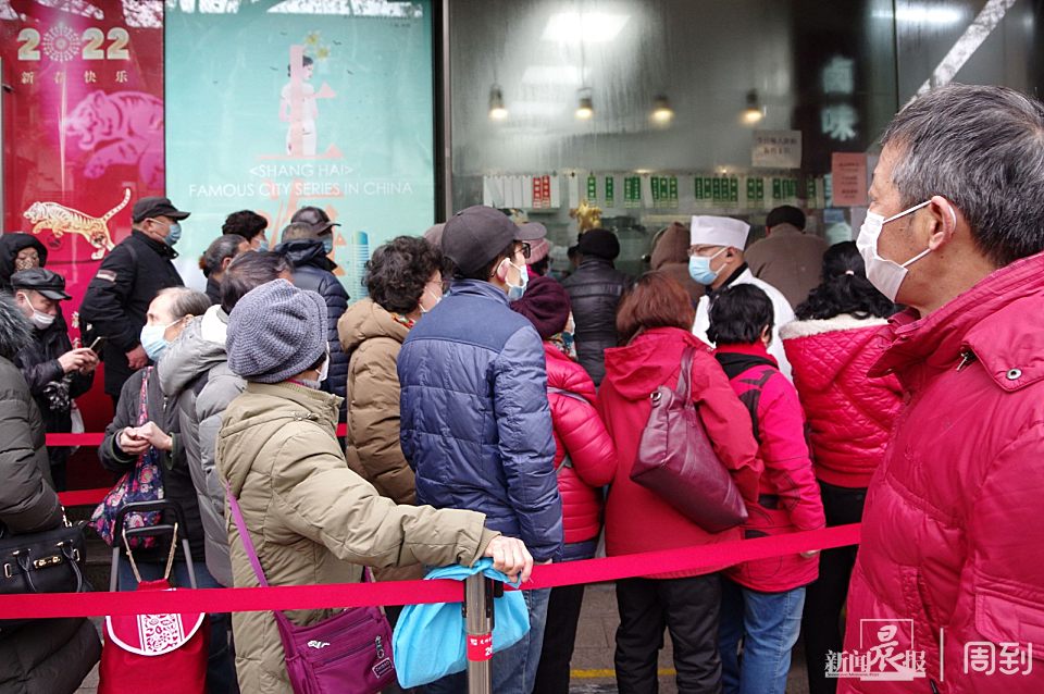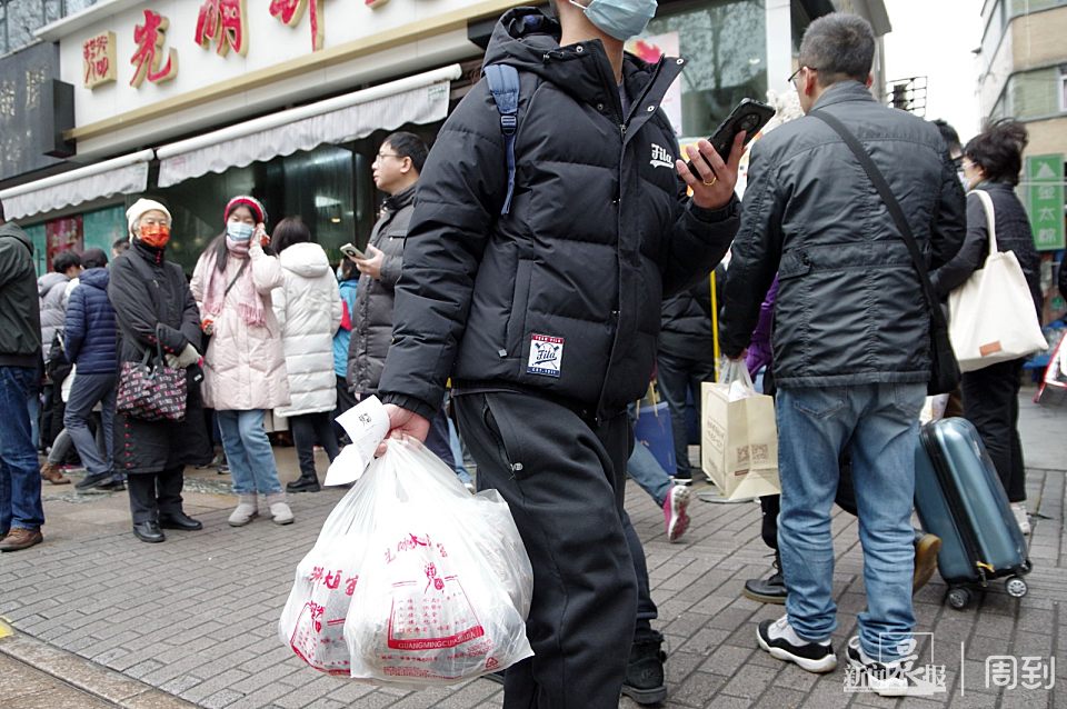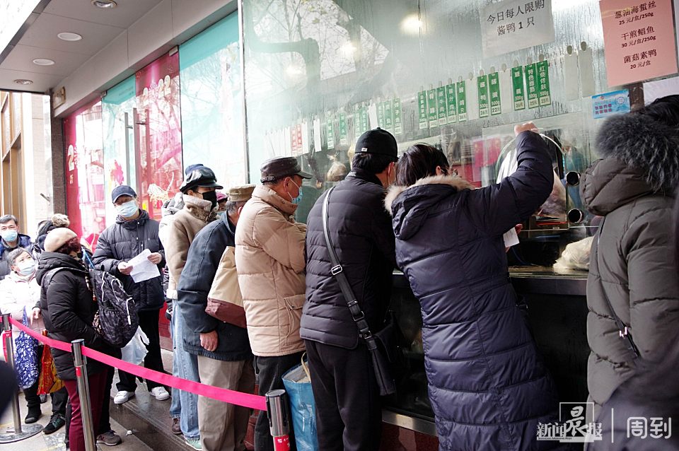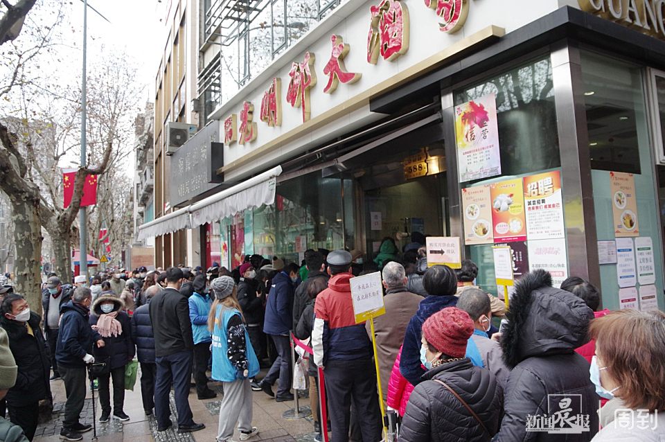 今天是小年夜,市民们已经准备年夜饭了,上海多家老字号半成品、熟食店家也迎来销售最高峰。上午11点,淮海中路光明邨大酒家门口,购买熟食的队伍已经排到三联书店门口,要买到美味熟食就要等上四个多小时。