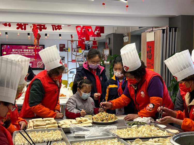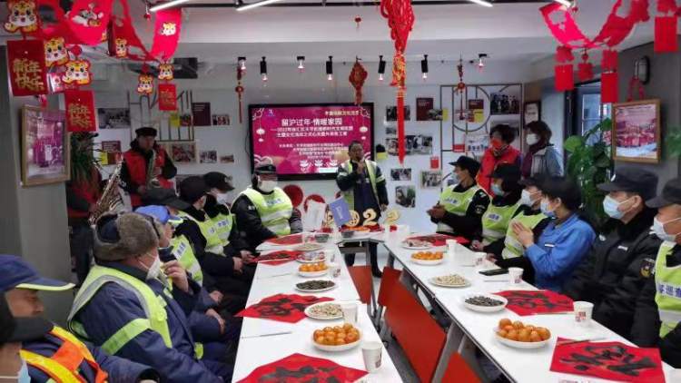 慰问宴上除了饺子,还有体现江南魅力的春卷,以及欢庆乐曲、书法礼品和童谣朗诵。这一次,天平街道社区发展办和志愿者们的慰问对象,是坚守岗位不离沪、放弃回老家过年的环卫工人、社区护工和小区保安。这些敬业的新上海人响应“留沪过年”的号召和节日防疫工作的需要,维护着社区运转。