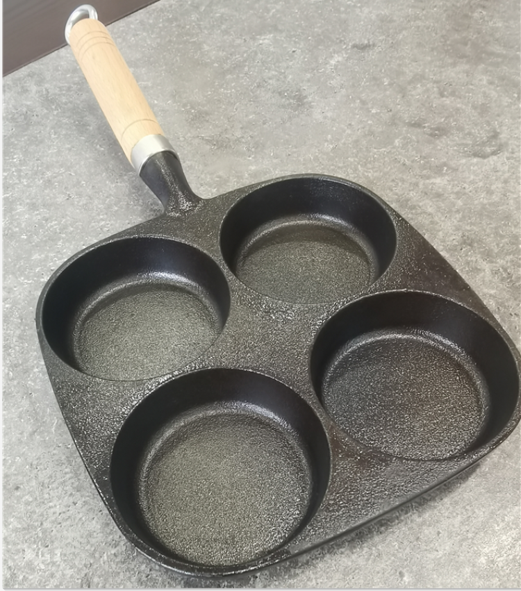 取锅(我自己使用四格煎蛋锅,见下图),也可使用较小规格的平底锅,不过操作难度比前者大一点。开火热锅,基本上,一直需要中小火来回切换。