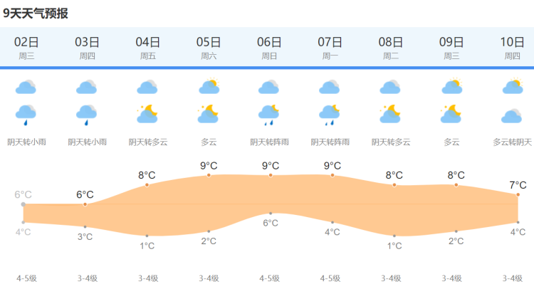 据中国天气网上海站预报,今明小雨过后,2月4日、5日雨水暂歇,但之后又将迎来阴转阵雨的天气。未来9天,气温方面变化不大,基本维持在1-9℃。但期间雨水不少,湿冷体感明显,小伙伴们出行防寒保暖措施要做好。