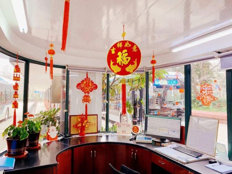 春节里,76路终点站面貌一新,而南浦大桥枢纽站内的公交65路终点站也布置得光彩夺目(见上图)。昨天下午,记者在这里看到,候车廊上挂满了红灯笼和中国结,灯笼与灯笼之间以及站点旁的树枝上挂上了彩灯。调度室外的窗户上贴上了窗花,调度室内也挂上了新春喜庆吊坠,整个终点站内充满了年味。巴士五公司一车队党支部副书记邵栋坤向记者说道: