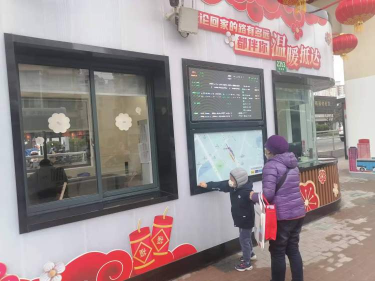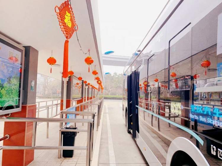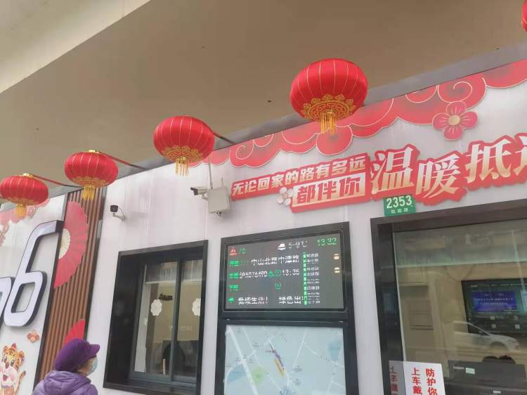 “无论回家的路有多远,都伴你温暖抵达”。只见车站上方这句用红字呈现的话语,给人以温暖。周围还有大红灯笼高高挂,布置着虎年吉祥物以及梅花花篮,看上去缤纷夺目。