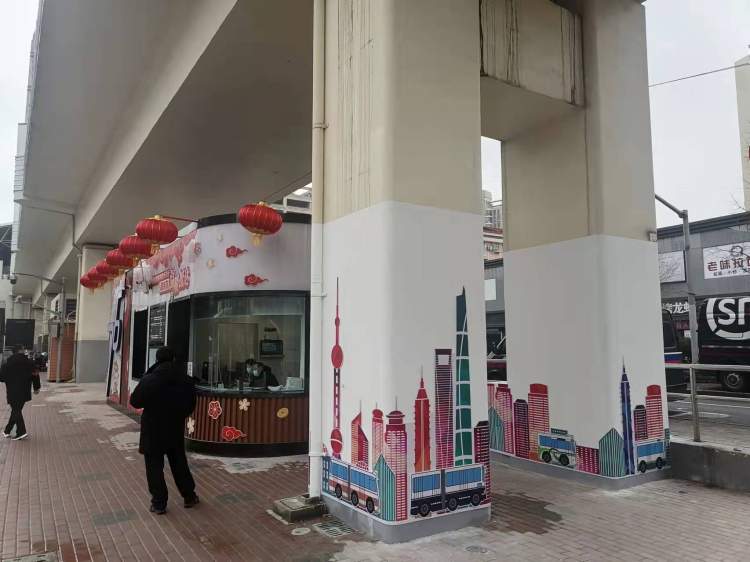 这座76路凯旋路、宜山路终点站,位于3号线高架轨道下方,建设者利用高架立柱,在立柱上布置了许多美丽的图案,其中有东方明珠标志性建筑,公交车在地面开行,似乎在向大家倡导“绿色出行”。