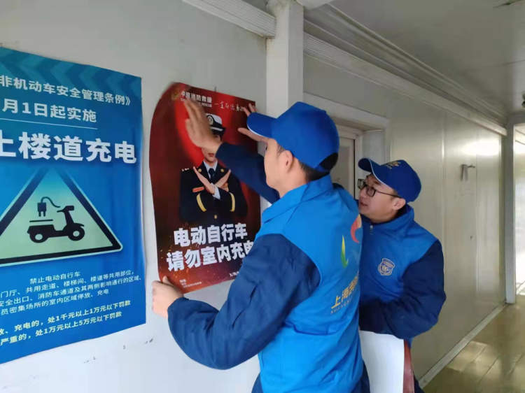 ▲“蓝马甲”在张贴电动自行车安全充电宣传海报