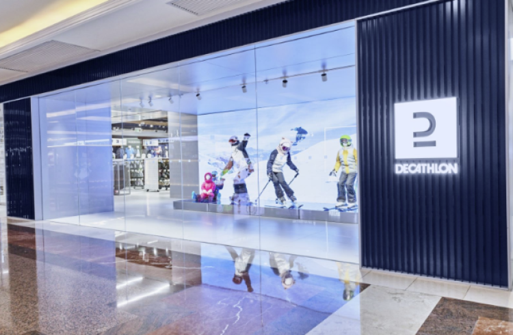 去年年底,迪卡侬在上海环球港开出了一家全新概念店,总共被分为20个展示区的店铺将入口橱窗的“C位”留给了冬季大热的滑雪运动。在LED背景墙播放的雪山画面前,身着全套装备的人体模特摆出了各式滑雪姿势,华丽酷炫又亮眼吸睛。