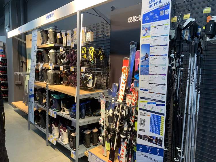 在迪卡侬花木店,冬季滑雪类产品的货架同样被安排在了靠近入口处的位置,看过滑雪服装、头盔护镜,石先生和女友径直往最靠里的双板区域走去。这对情侣在数年前一同喜欢上了滑雪,之前几次前往雪场滑雪都是租用了现场的装备,今年则打算一人配上一套:“别的基本都有,主要今天想来看看雪板,再配个大一点的包。”