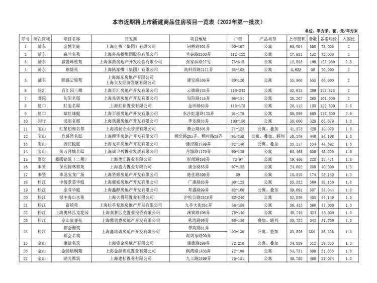 今年第一批新房源公布,单价6万以下新房占近7成! 林劲榆 2022-2-14 来源:周到上海 今天,上海市房管局宣布,2022年第一批房源以集中批量供应的方式推出。 据悉,该批房源共涉及33个项目,总建筑面积约129万平方米,共计11,812套,备案均价57,899元/平方米,分布在浦东、普陀、虹口、杨浦、闵行、宝山、嘉定、奉贤、松江、金山、青浦、崇明、临港13个区域。 备案均价在6万元/平方米以下的项目23个,面积占比约69.2%;10万元/平方米以上的项目5个,面积占比约15.4%。续盘项目15个,新开楼盘18个。 来源:周到上海 作者:林劲榆 赞一个 (0)