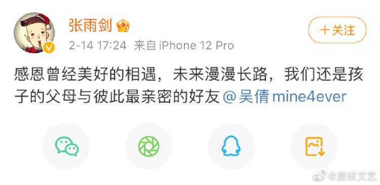 2月14日,吴倩在微博晒出自己和女儿一起玩耍的照片,并配文表示,“单身姑娘们的情人节约会”。随后,吴倩工作室发布声明,称吴倩与张雨剑已和平结束婚姻关系,后续也不会再作出回应。对此,张雨剑也发文呼应,“感恩曾经美好的相遇,未来漫漫长路,我们还是孩子的父母与彼此最亲密的好友。”