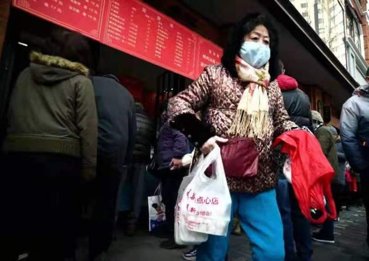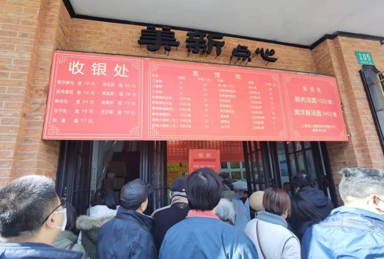 在陕西北路上的美新点心店门口,两条队伍一左一右延伸向人行道的两方。