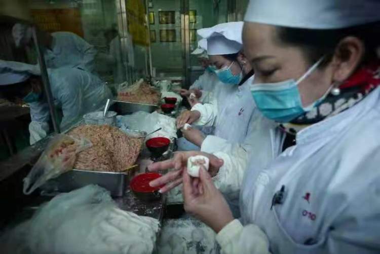 店内,原本的堂食已经取消,堂食空间开辟给师傅们现场制作,玻璃墙外都能看得见。