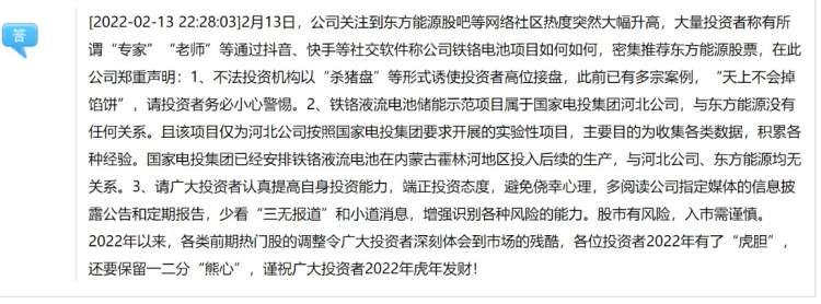 东方能源提醒广大投资者。铁铬液流电池储能示范项目属于国家电投集团河北公司,与东方能源没有任何关系,国家电投集团河北公司与东方能源均属国家电投集团的二级单位,并非东方能源的子公司。且该项目仅为河北公司按照国家电投集团要求开展的实验性项目,主要目的为收集各类数据,积累各种经验。国家电投集团已经安排铁铬液流电池在内蒙古霍林河地区投入后续的生产,与河北公司、东方能源均无关系。