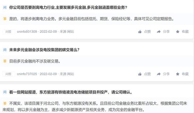 早在2月9日,就有投资者询问东方能源,“看一些网站报道,东方能源有铁铬液流电池储能项目并投产,请公司确认。”东方能源回复,“不属实,该项目属于河北公司,与东方能源没有关系。且目前公司金融业务比重所占较大,根据集团公司未来规划,将以多元金融为主,逐步减少新能源资产及相关业务,成为完全的金融平台,多元金融目前包括信托、期货、保险经纪等。”
