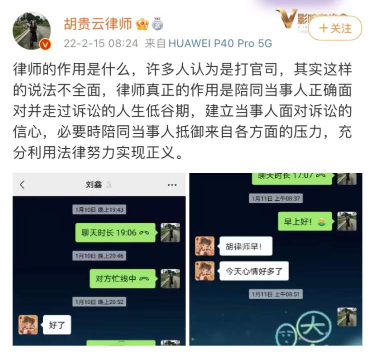 2月15日,胡贵云律师将她与刘鑫的微信聊天记录发布在微博上,并表示:“律师的作用是什么,许多人认为是打官司,其实这样的说法不全面,律师真正的作用是陪同当事人正确面对并走过诉讼的人生低谷期,建立当事人面对诉讼的信心,必要时陪同当事人抵御来自各方面的压力,充分利用法律努力实现正义。”