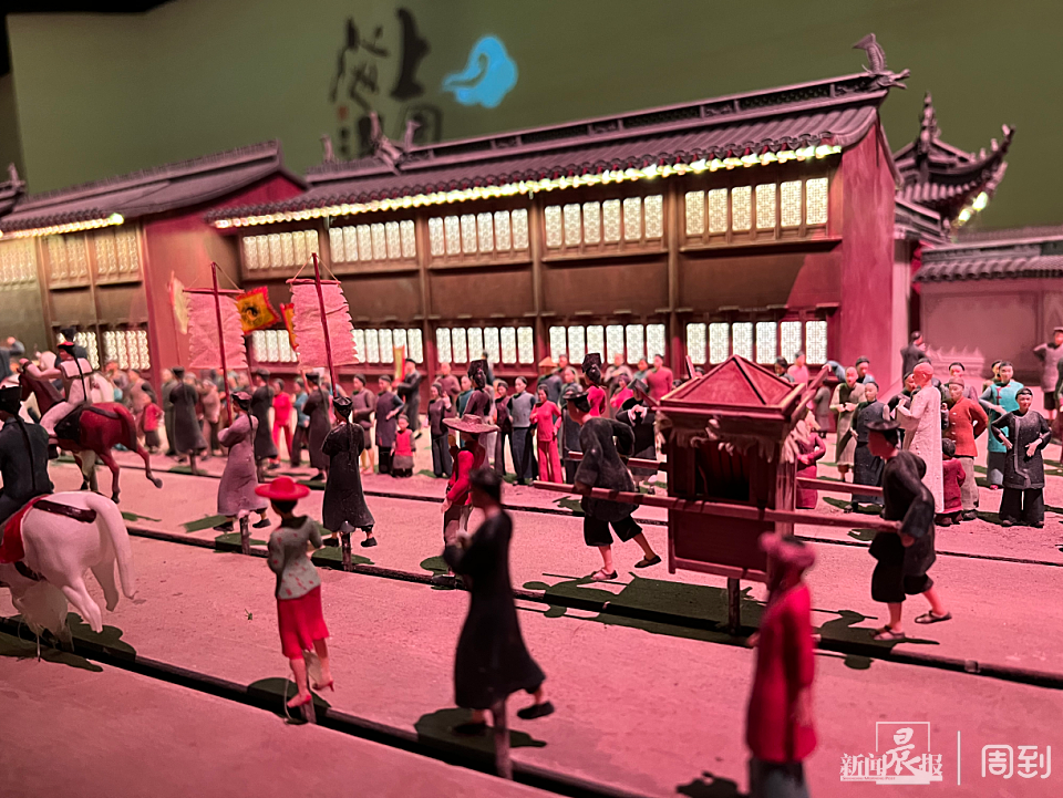 建筑内的每一处细节都经得住放大镜的考验。穿蓝灰色长衫的说书人在豫园湖心亭茶馆内登台,他手握折扇,小如指甲盖的扇面上绘制了水墨文人画。沿街的庙市上,小笼馒头、梨膏糖、鸭血粉丝汤层层叠叠,正待出锅。仰山堂内,近50个造型各异的人物,完整演绎了《光绪庚辰年豫园宴乐图》中,上海道台刘瑞芳宴请德国皇孙海里希亲王共赏昆曲的排场。
