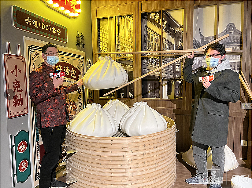 记者与徐明在小笼馒头模型前进行互动体验