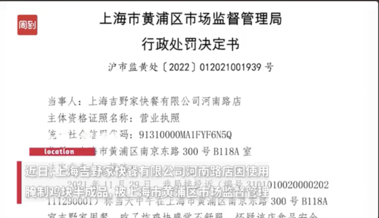 近日,上海吉野家快餐有限公司河南路店(以下简称“吉野家河南路店”)被曝因使用超过保质期的腌制鸡块半成品,被上海市黄浦区市场监督管理局罚款1万元,引起社会热议。