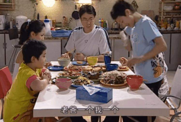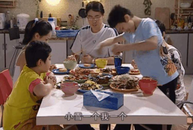 这张桌子永远满满当当,丰富的菜色搭配各种颜色的餐具让人食欲大开,而围聚在餐桌前的这一家人,更为我们呈现了太多的欢乐时光,比如经典的刘星式分肉饼↓