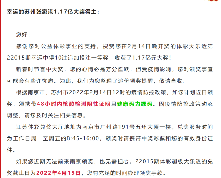2月16日,江苏体彩中心通过官方渠道给苏州1.17亿大奖得主发去一封信,提醒这位大奖得主如何去领奖,“根据南京市、苏州市2022年2月14日12时的疫情防控政策,如您计划近日领奖,须携带48小时内核酸检测阴性证明且健康码为绿码。因疫情防控政策动态调整,请您及时关注相关信息。”