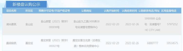 据网上房地产消息,金山【云湖壹号】、嘉定【格林云上】2月20日开启认购。