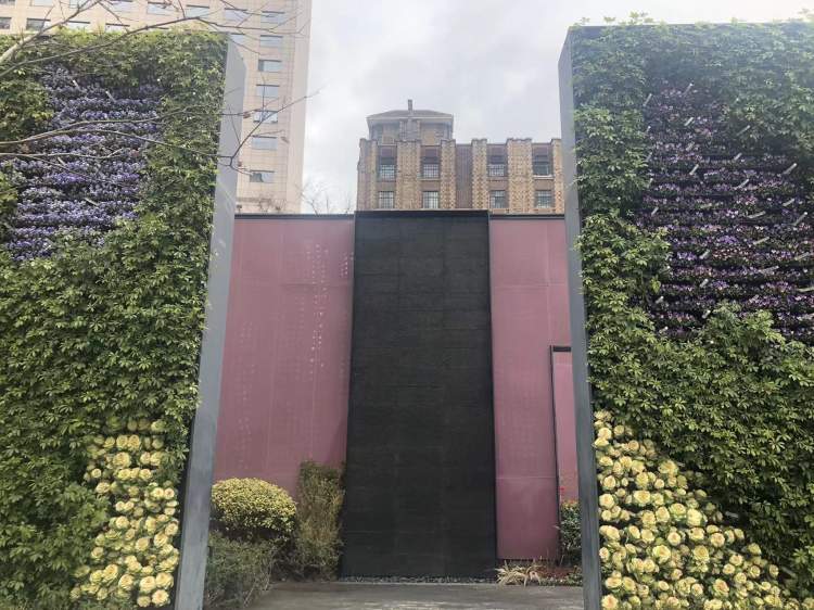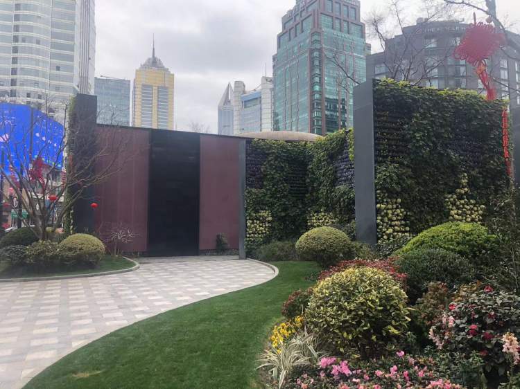 从垂直绿墙中间的小径走进公园,迎面是一堵水幕墙,水的灵动降低了外部城市空间的噪音,也为内部庭院的静态美带来了动感旋律。绿墙围合起来的是一个庭院,布局体现了中国传统园林移步异景的意趣。一株红梅正绽放出花朵,茶梅也在开放,不怕冷的三色堇和其他地被为冬天的花园更添美景。