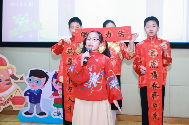 “春联是我国特有的文学形式,可以唤起武小师生对新年、新岁、新学期的美好向往和祝福。学校便决定,在开学首日举办春联擂台赛, 每个班级推选出最佳春联,由学生们一一上台展示。” 武宁路小学校长孙纳新表示。