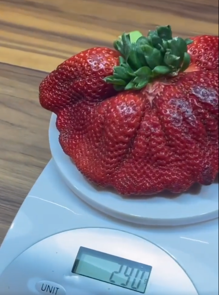 阿里尔的农场种出了四颗巨型草莓,这颗是其中最大的一个。而“世界上最重的草莓”之前的记录是250克,由日本福冈县农民中尾浩二在2015年种出。