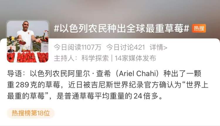 近日,#以色列农民种出全球最重草莓#登上微博热搜,一颗重289克打破吉尼斯纪录。