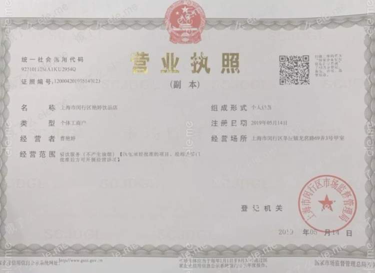 据该店公示的营业执照,该店登记的名称为“上海市闵行区艳婷饮品店”,类型为“个体工商户”。