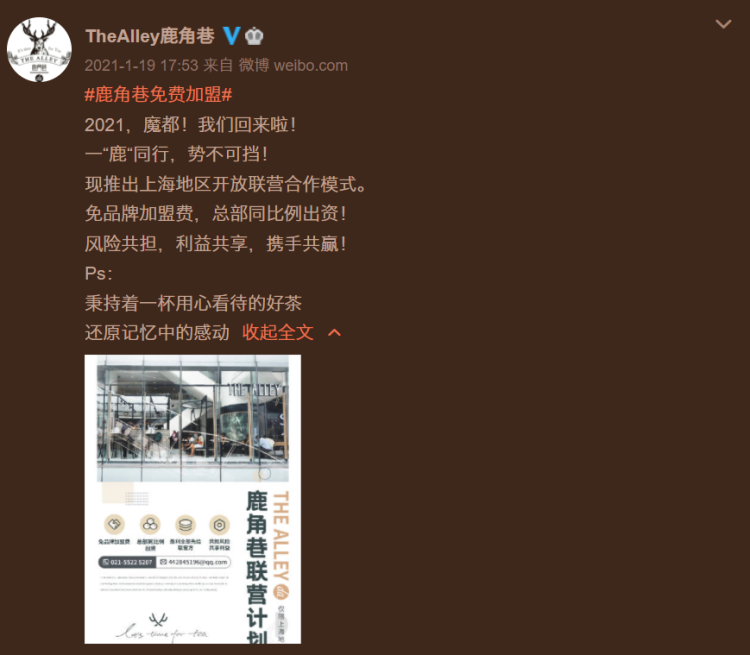 记者注意到,在2021年1月,鹿角巷曾发布过一项“鹿角巷联营计划”的方案,称“2021魔都我们回来啦!”这其中,上海地区开放联营合作模式,免品牌加盟费,总部同比例出资。