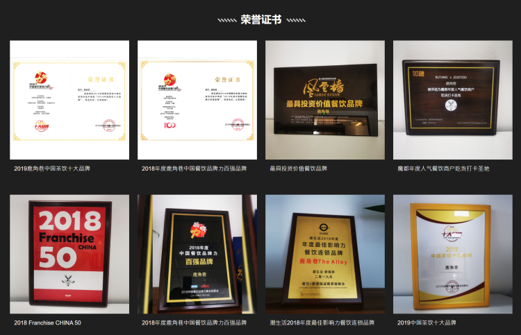 在鹿角巷官方网站,陈列有诸多鹿角巷所获荣誉,如“中国茶饮十大品牌”“中国餐饮品牌百强”“魔都年度人气餐饮商户吃货打卡地”等,但这些荣誉证书和奖牌奖章均集中在2018年、2019年。