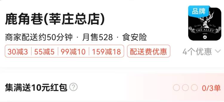 不过,如今的外卖平台上仍有商户以“鹿角巷”之名卖茶饮。在这家名为“鹿角巷(莘庄总店)”的店铺中,可以看见它使用的是与正牌鹿角巷相似的鹿头标志与饮品杯,乍一看很像正牌鹿角巷。