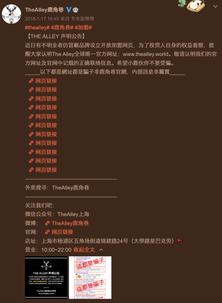 早在2018年1月,鹿角巷就曾发布过打假信息,称“近日有不明业者仿冒品牌设立开放加盟网页”,并一口气挂出了11个网页链接,称“以下网址都是骗子而非鹿角巷官网”。