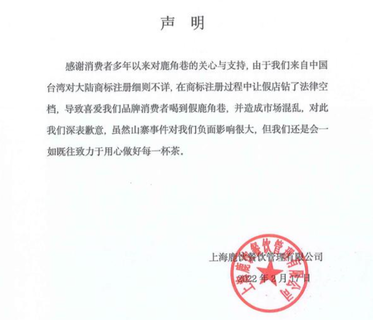 据鹿角巷近期发布的声明称,由于品牌来自中国台湾,对大陆商标注册细则不详,在商标注册过程中让假店钻了法律空档,导致消费者喝到假鹿角巷,造成市场混乱,对此深表歉意。